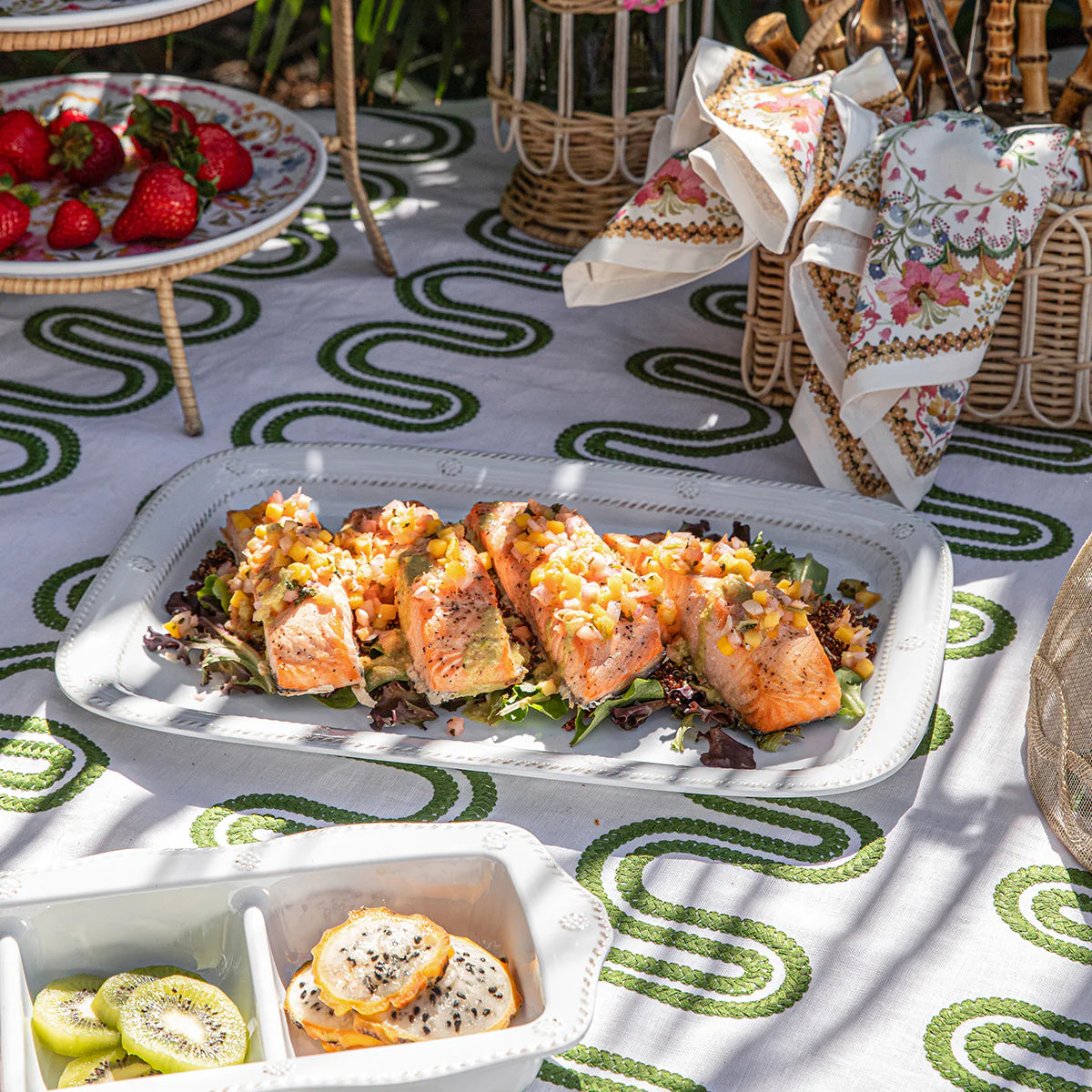 From Juliska's Al Fresco Collection- Trimmed with simple thread and adorned with a sprinkling of berries, this durable serving tray will transport your dinner directly from the grill to your table with ease.
