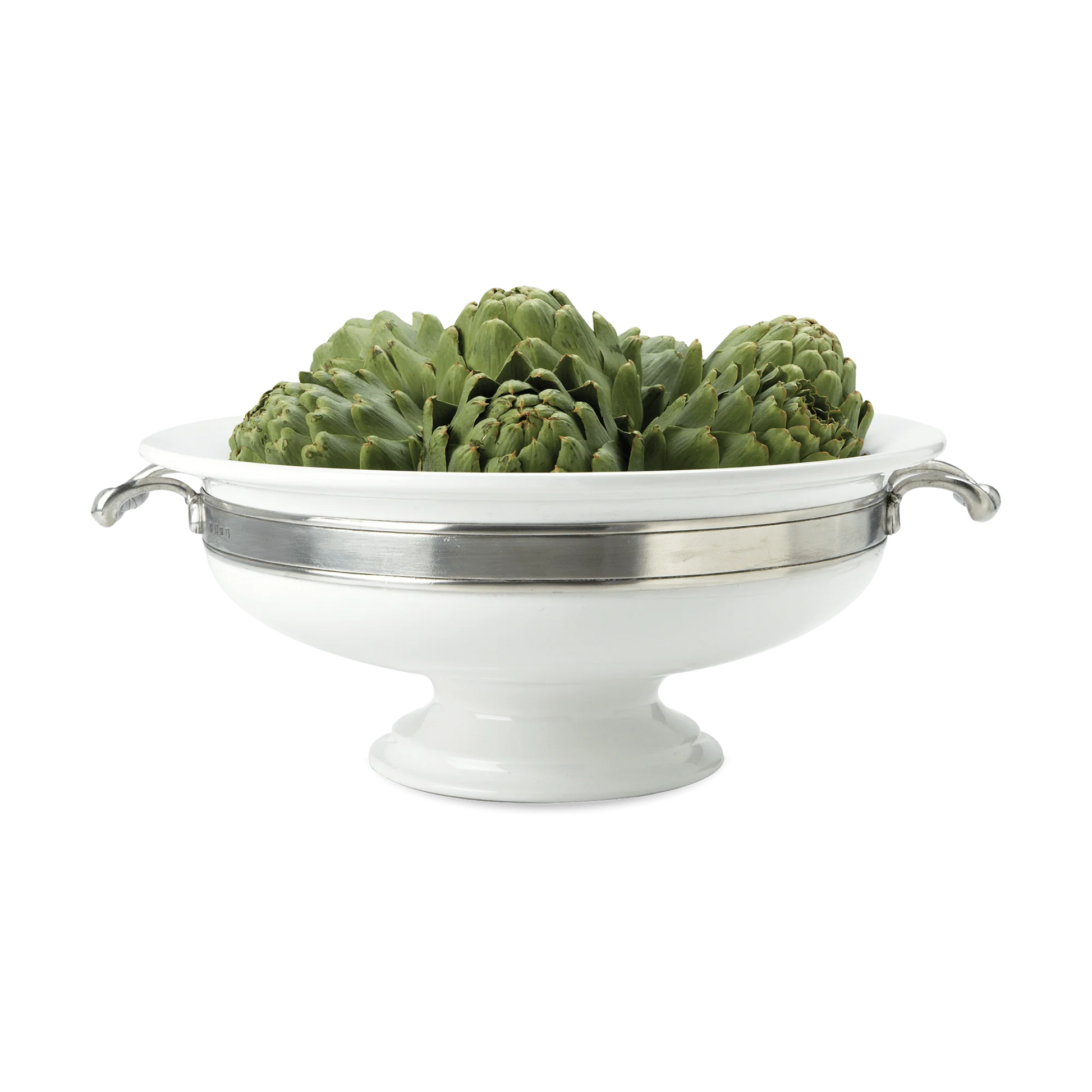 This footed centerpiece is considered a “one and done” of table design — a handsome ceramic piece that makes a quietly beautiful statement whether filled or not. This round handled bowl wears a pewter belt that’s stamped with hallmarks representing MATCH Pewter, the tin content of their alloy, and city in Italy where it's made.