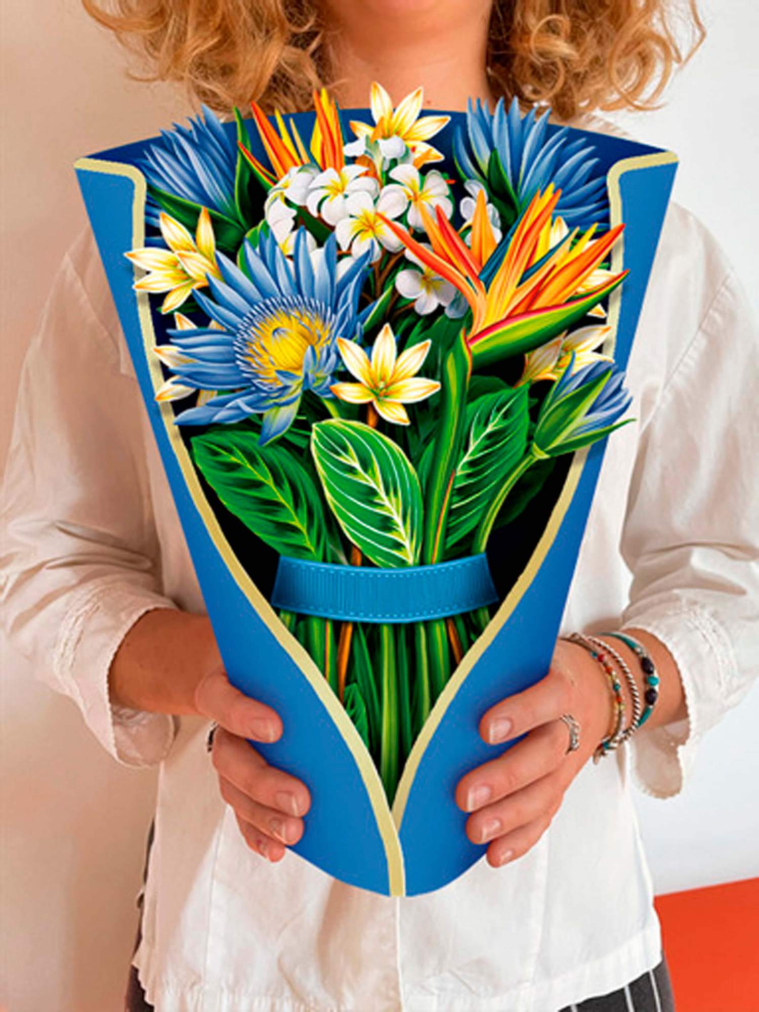 FreshCut Paper's journey of color and design, the Birds of Paradise in our Tropical Bloom bouquet represent flights of freedom and optimism. Mixed with vibrant blue Lotus blossoms, a symbol of rebirth, and the fragrant Plumeria, a Hawaiian symbol of hope, this whimsical and enduring bouquet evokes the promise of the future.