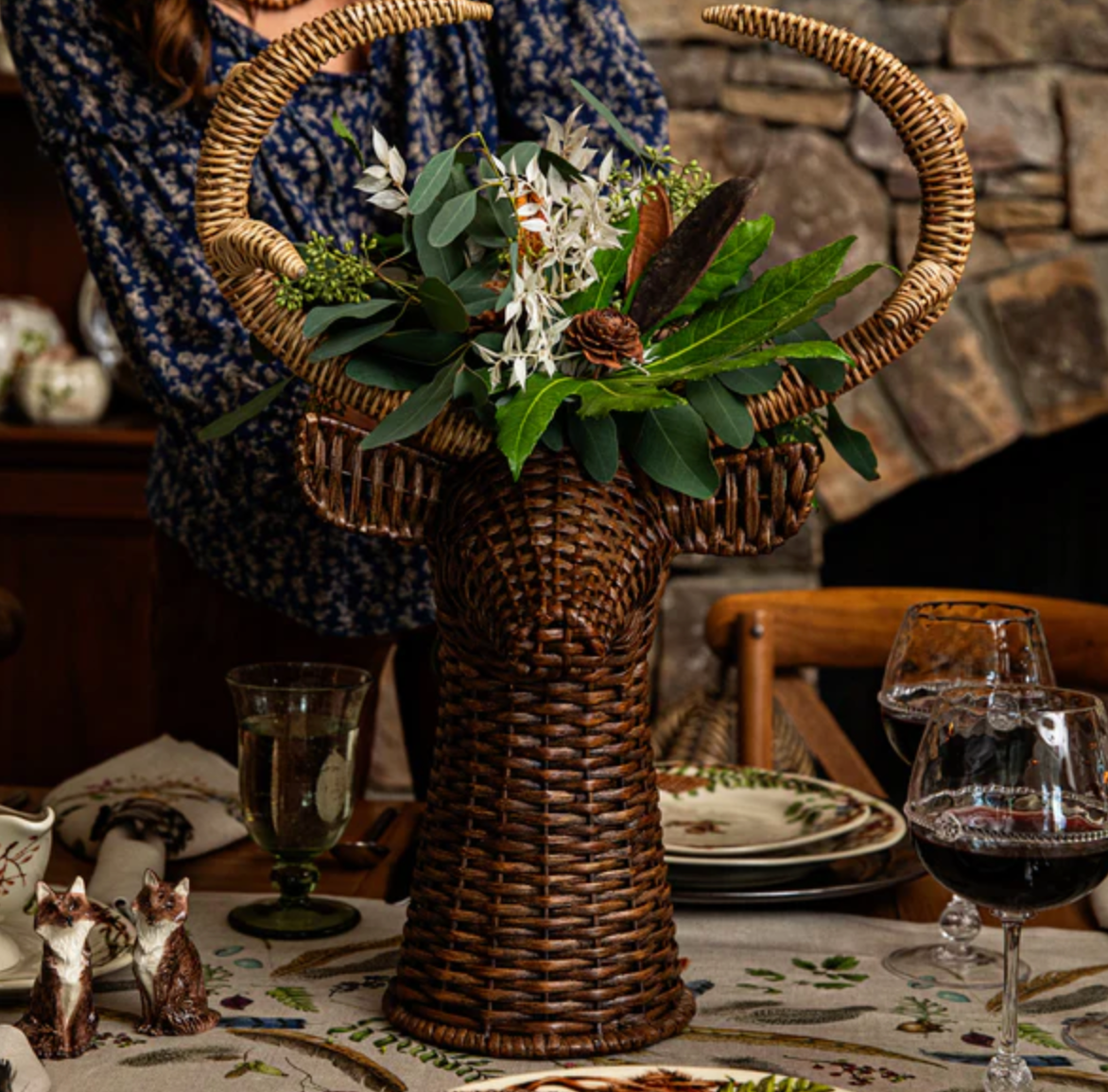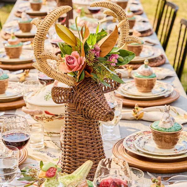 A magnificent display of woodland wonder for Fall decorating, our stately stag brings natural drama and delight to your entryway, mantelpiece, buffet, or dining table. Hand-made of beautifully woven abaca, wicker and rattan, with a clear glass vase nestled within to house whatever autumnal arrangements you dream up.