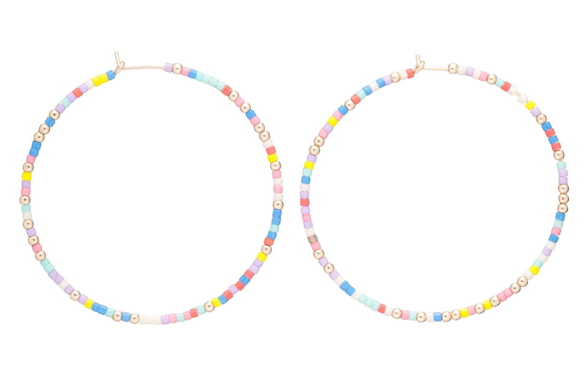 - Made with various colors of randomly mixed 2mm seed beads and 2mm 14k gold-filled beads on a 1.75" hoop