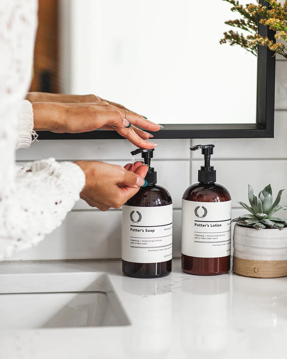 HAVE YOU EVER WONDERED HOW POTTERS KEEP THEIR HANDS SO CLEAN AND SOFT AFTER WORKING WITH CLAY ALL DAY? WELL, LOOK NO FURTHER. WE CREATED A COLLECTION OF SOAP AND LOTION TO KEEP YOUR HANDS FEELING SOFT, MOISTURIZED, AND OH-SO CLEAN! TAKE IT FROM US, WE KNOW HOW TO GET MUD OFF.