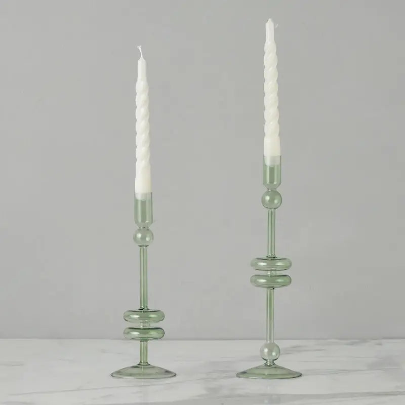 Elevate your home decor with a pair of Sage Green Glass Candlesticks. These expertly crafted taper candle holders add a touch of timeless elegance to any room. Available in three sizes, they are perfect for adding a pop of color to your dinner party or creating a statement throughout your home. Mix and match the sizes and colors to create a memorable tablescape.