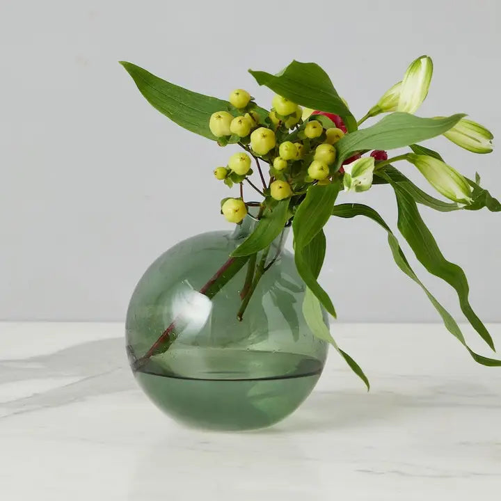 The Sphere Bud Vase is a unique vessel designed to sit slightly off center on your tabletop. A sleek coffee table accent or shelf styler, this green-tinted vase is elegantly imperfect due to the artisanal craftsmanship used to create it. Easily display single stem greenery or fresh cut flowers in this unique vessel.