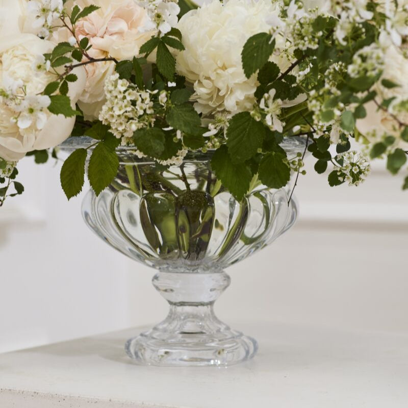 Create a stately arrangement with the weighted glass Hathaway Collection. Featuring lots of dimensional details, thick glass, & a classic design, these vessels offer a vintage feel & sturdiness that will keep florals in place.