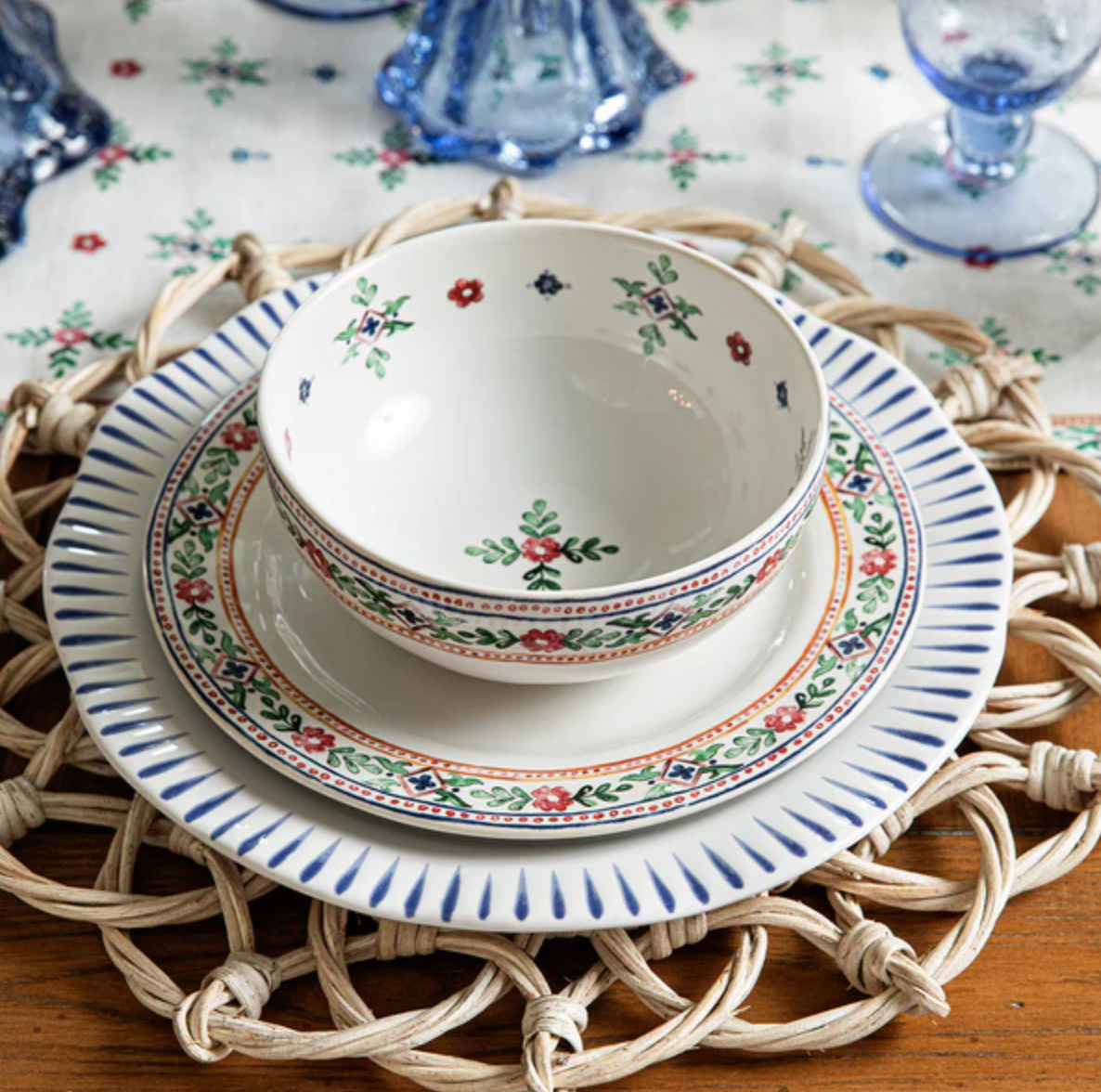 Chic, chalet style is in full bloom with this collection that is inspired by folkloric wildflower motifs from the Alps. With a prim, painterly rim rendered in rich, traditional colors, this dessert/salad plate is perfect for layering with other collections and serving up delicious fare in high mountain style.