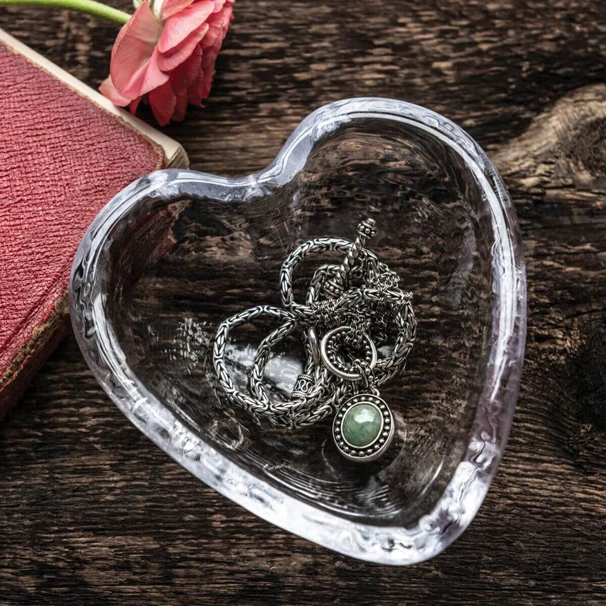 This gently rounded textured glass heart dish makes a sweet bedside table jewelry holder, candy dish or everyday reminder of your affection atop an office desk. Use it to set a romantic table or show that special someone the brilliance of your love.