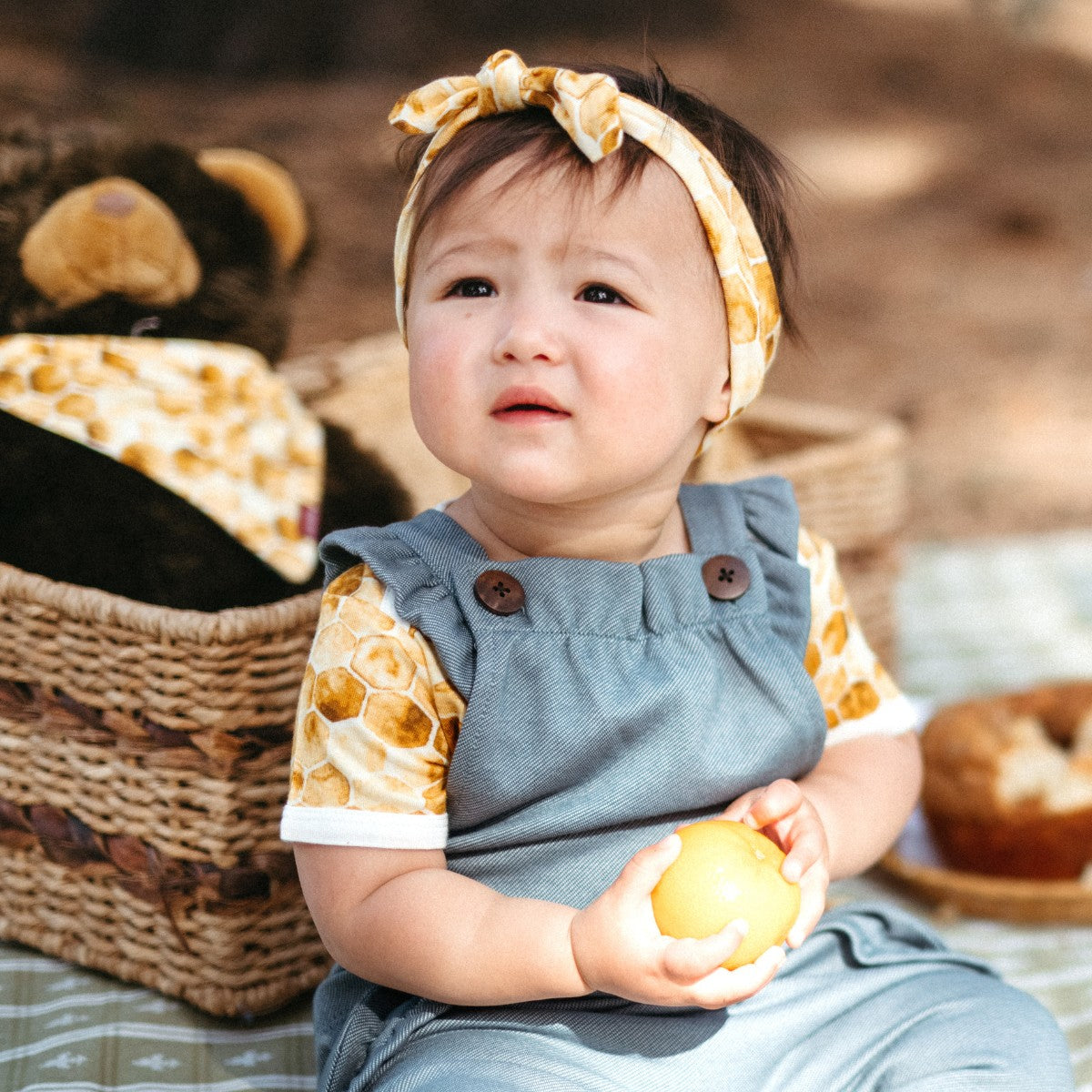 Easily slip on our knotted bamboo Headband in the Honeycomb print for a subtle coordinating accent to our little one’s ensemble. One size fits most babies and toddlers. We package each Headband on a playful, sturdy paperboard hanger.