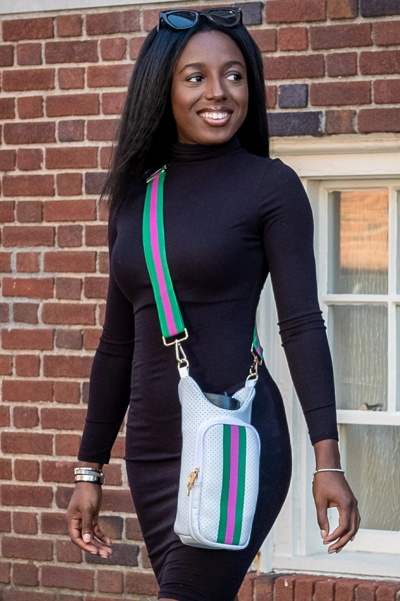 HydroBag in White Coated Perforated Neoprene with Pink + Green Stripe Strap