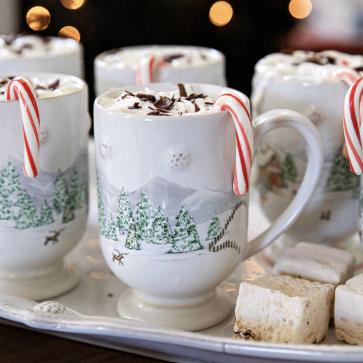 The mythical, folkloric world of the North Pole is hand illustrated atop iconic Berry & Thread shapes in this new holiday collection. Find Santa’s cottage depicted on this mug with subtle berry detail.