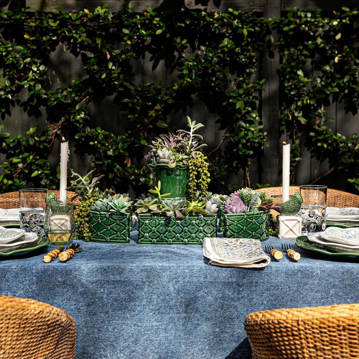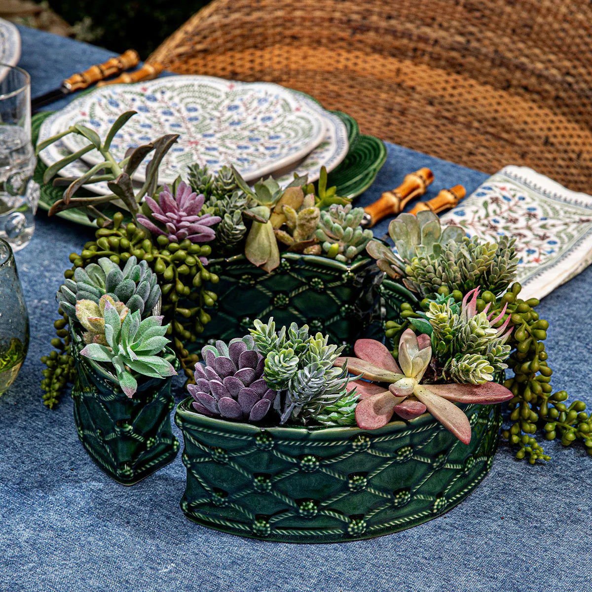 Create your own fantasy tabletop garden inspired by the formal parterre gardens of Château du Villandry in France. This fabulously unique set of two ceramic vases in our lush, verdant green glaze and Berry & Thread lattice work motif can be endlessly configured to display your beautiful blooms, whether they’re forever florals or picked freshly from your garden. Use them to encircle the base of a vase, or in combination with our other parterre sculptural pieces.