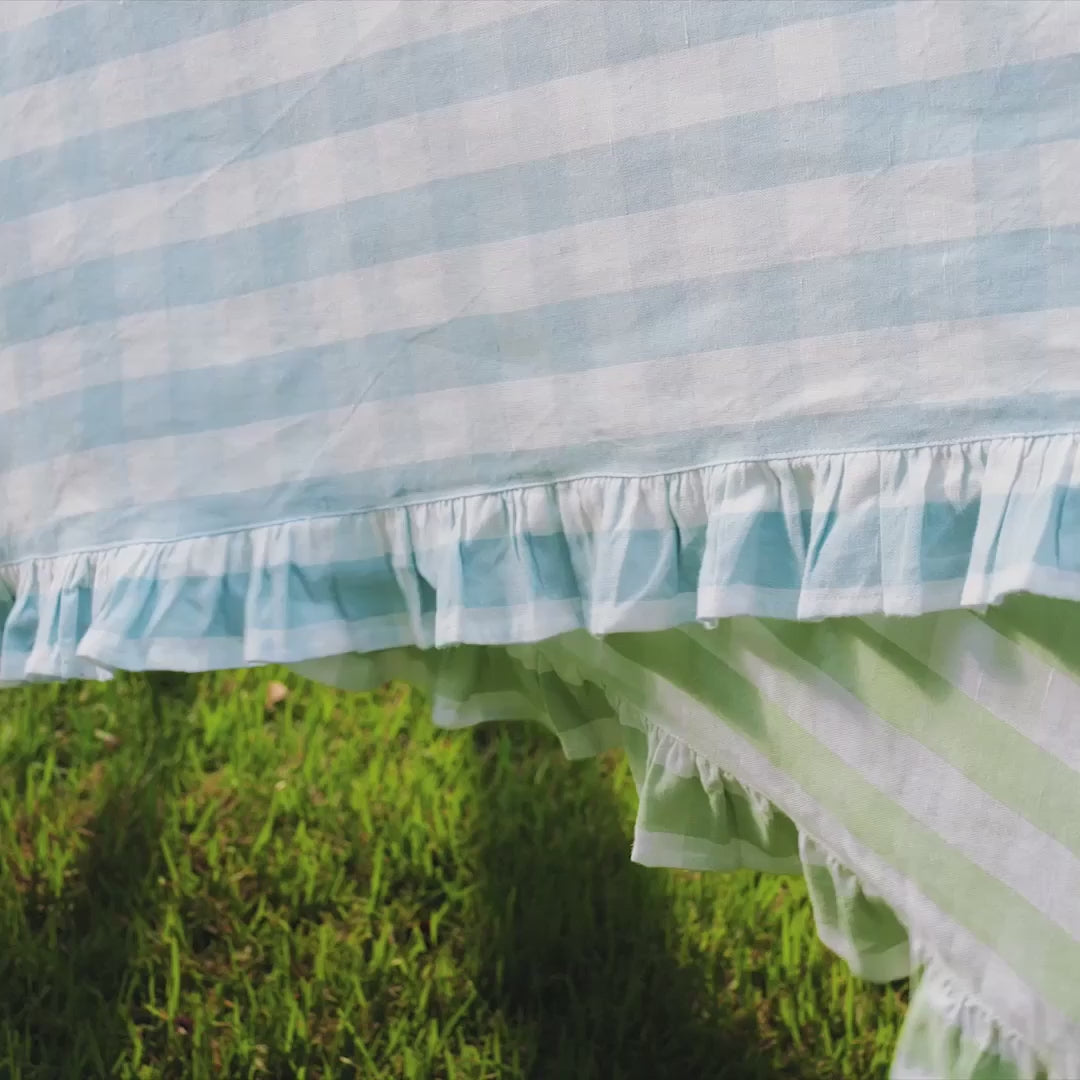 A classic gingham table runner is embellished with a ruffled edge for a touch of romantic country charm and easy elegance that’s perfectly lovely for garden parties, summer fêtes—and every day in between.