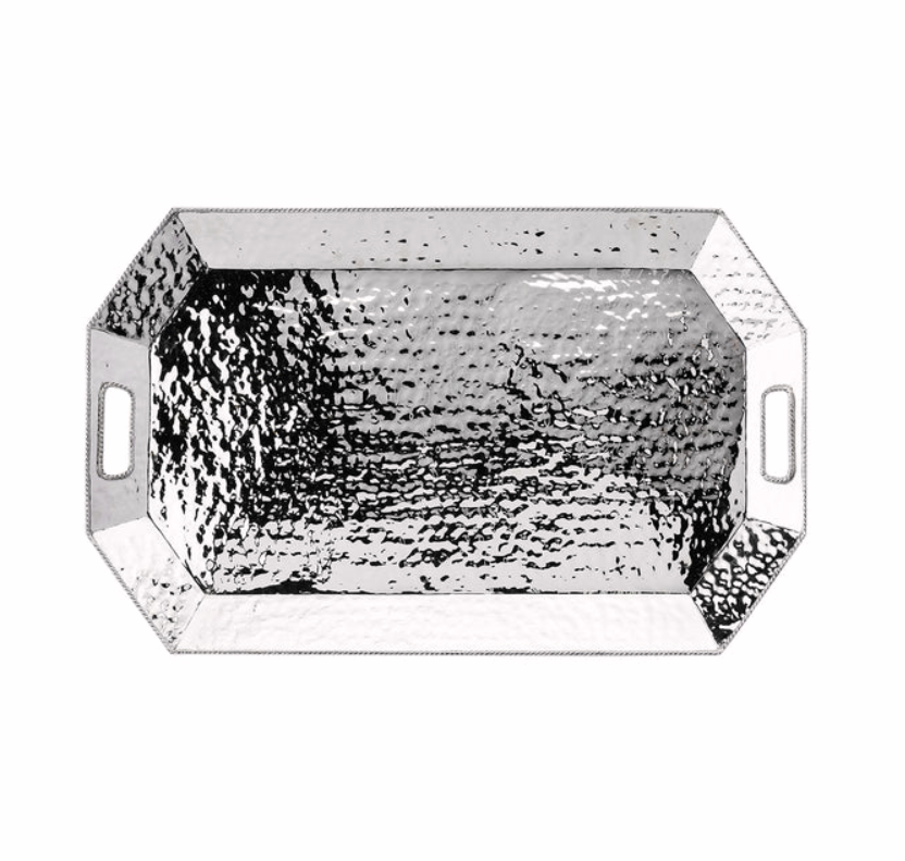 Decorated with a tidy trimming of simple thread, each piece in our Graham barware collection is handmade in hammered stainless steel and polished to brilliance. This spectacular tray and stand set come as two pieces, perfect for showcasing in your library, living room and entryway! The tray fits snuggly into the stand by nesting neatly into four slots. The stand's base sits on top of adjustable rubber anti-scratch pads that can be used to level the stand; which folds shut with a hook and eye latch when not in use.