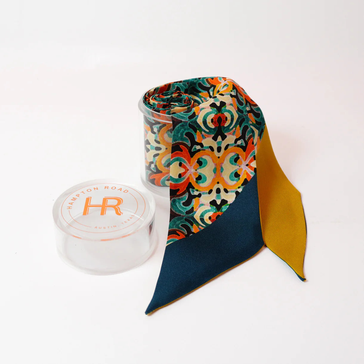 These small silk scarves can be worn infinite ways, effortlessly elevating everyday look! You can tie your twilly on a bag, or a purse handle. Tie the scarf around your head as a headband. Or, use the gold toned horseshoe charm to cinch it to your neck for the French look.