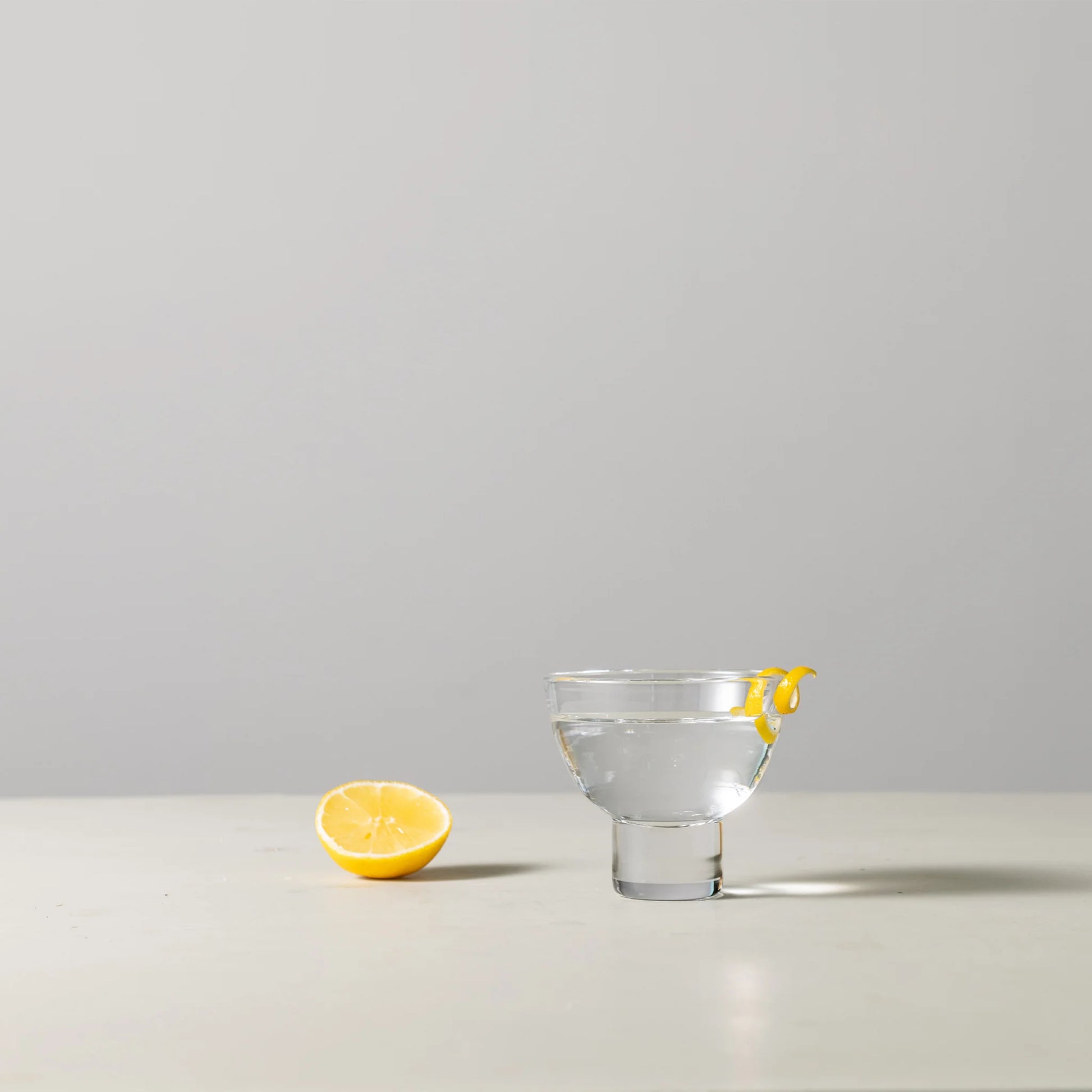A fresh take on a stemless martini, the generous bowl of this geometric cocktail glass sits perched on a sturdy cylindrical foot. Use this contemporary low coupe to serve up seasonal sips or even an icy dessert.