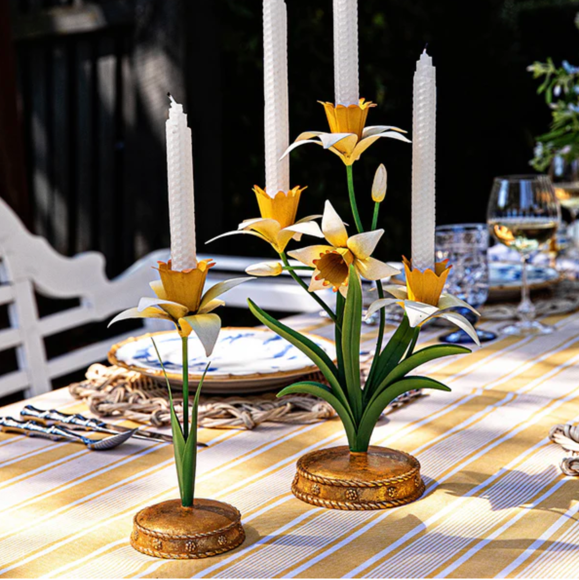 Spring is permanently sprung with this delightful Daffodil Centerpiece Candelabra that brings sophistication and joy to any tablescape. Made of intricately hand-painted metal in sunshine yellows, fresh greens and whites, upon a bright gold base that’s trimmed with the iconic Berry & Thread motif.