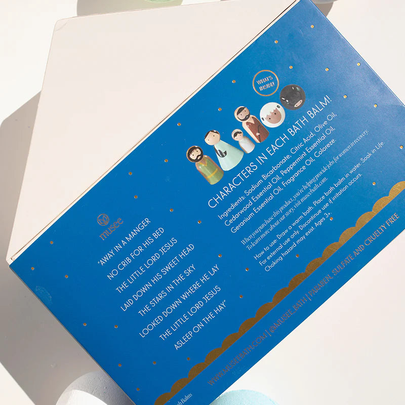 Imagine the majestic, holy night that Christ was born in a humble stable. Make bath time a moment to share the true meaning of Christmas with your little ones as they enjoy the surprises inside Musee's “Away In A Manger Six Balm Set” with wooden peg dolls as the figurines from the nativity.