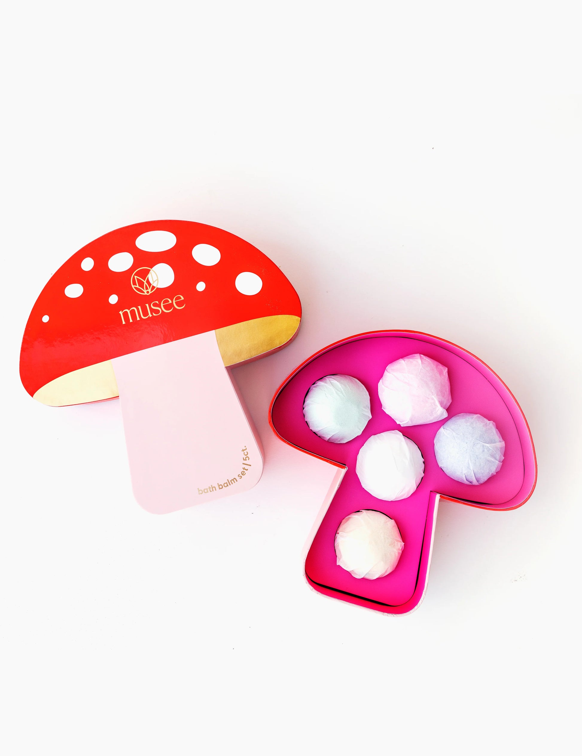 Bring a little whimsy to your bath with our adorable mushroom shaped gift set. This set features five 4 oz. bath balms with magical treasures in each balm! Ingredients: Sodium Bicarbonate, Citric Acid, Jojoba oil, Tea tree essential oil, fragrance oil, coloreze.