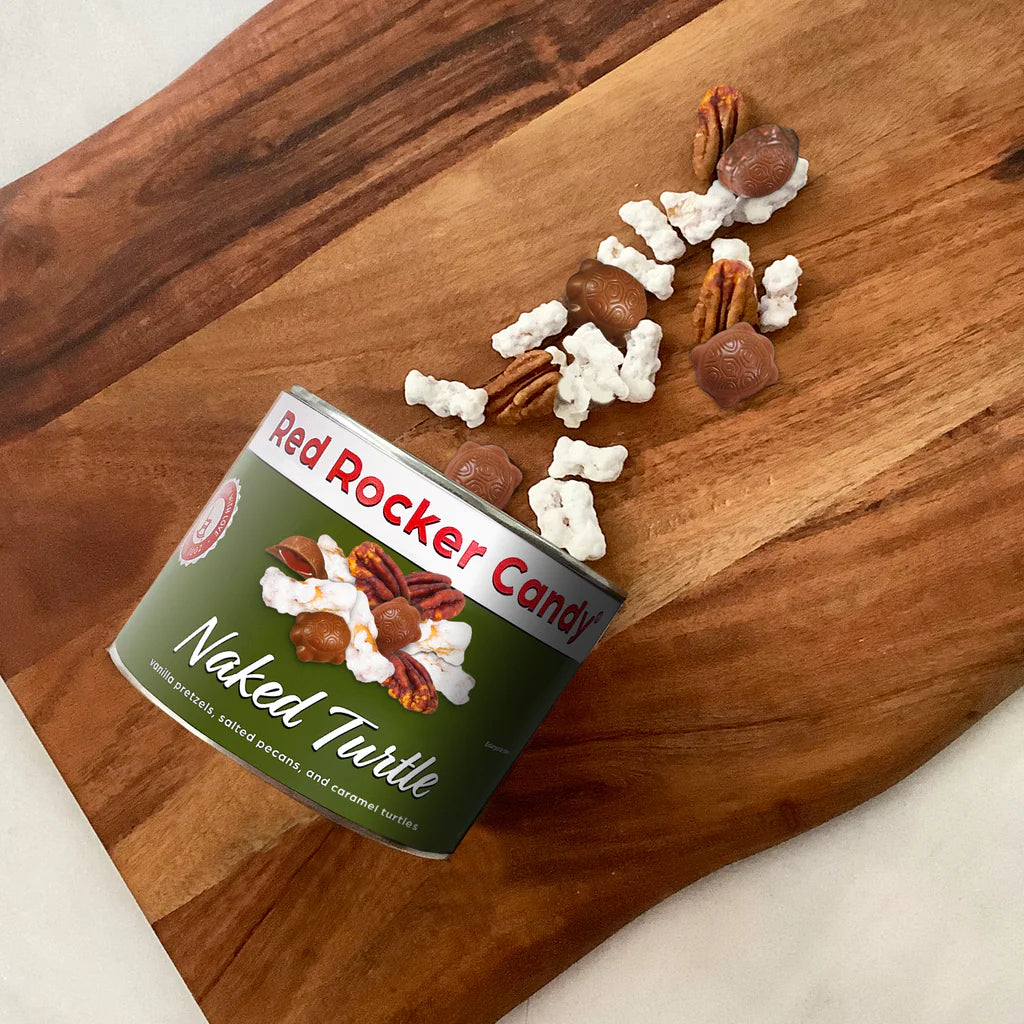 "A chocolate candy classic stripped-down, as the name implies, to its barest elements! Vanilla pretzels, salted pecans, and caramel turtles make our Naked Turtle pretzel mix a purely decadent treat."