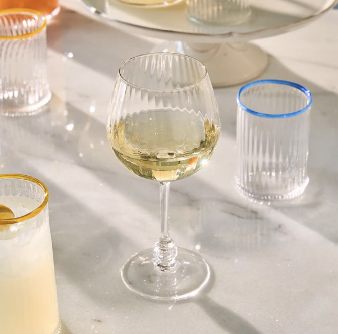 This stunning glass is a masterclass of mouth blown artistry, with a faceted effect that shimmers in the light atop a sophisticated stem that’s accented with intricate details at the base. The understated elegance of this wine glass makes it perfect for everyday sipping and special occasions alike.