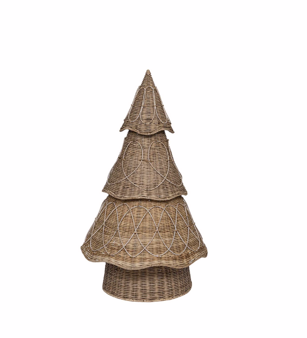Create the magic of a winter wonderland with a fabulously unique forest of trees in beautifully hand-woven rattan. This statement-making spin on the classic evergreen is visually stunning, natural, and neutral for decorating indoor spaces with a festive sense of drama and an undeniable element of whimsy. When the season ends, this stacking set can be dismantled and nest together for easy storage.