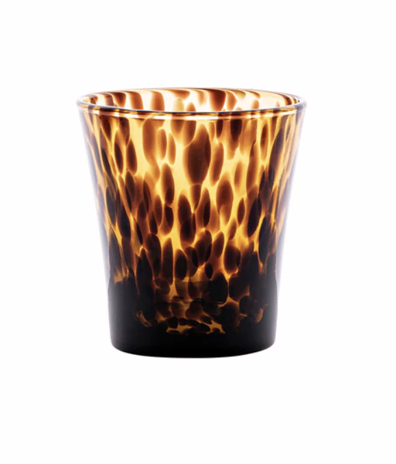 Juliska's richly hued tortoiseshell glassware with translucent brown body and dark specks make a handsome statement on every table.