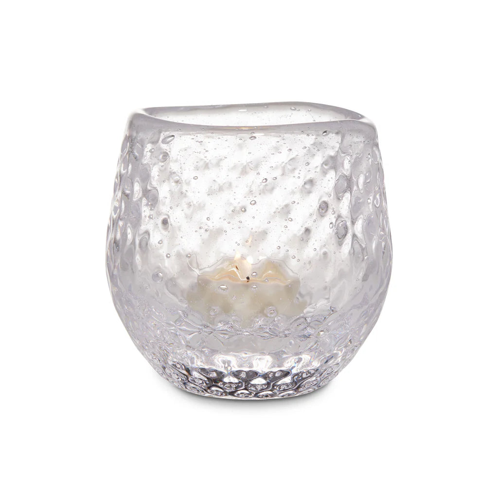 This textural tealight brings the play of snow and ice to life through shimmering glasswork. Its free-flowing form and organic rim reflect the artistry of handblown glass. Enhance any moment with the trellis pattern of light refracted through this gorgeous tealight.