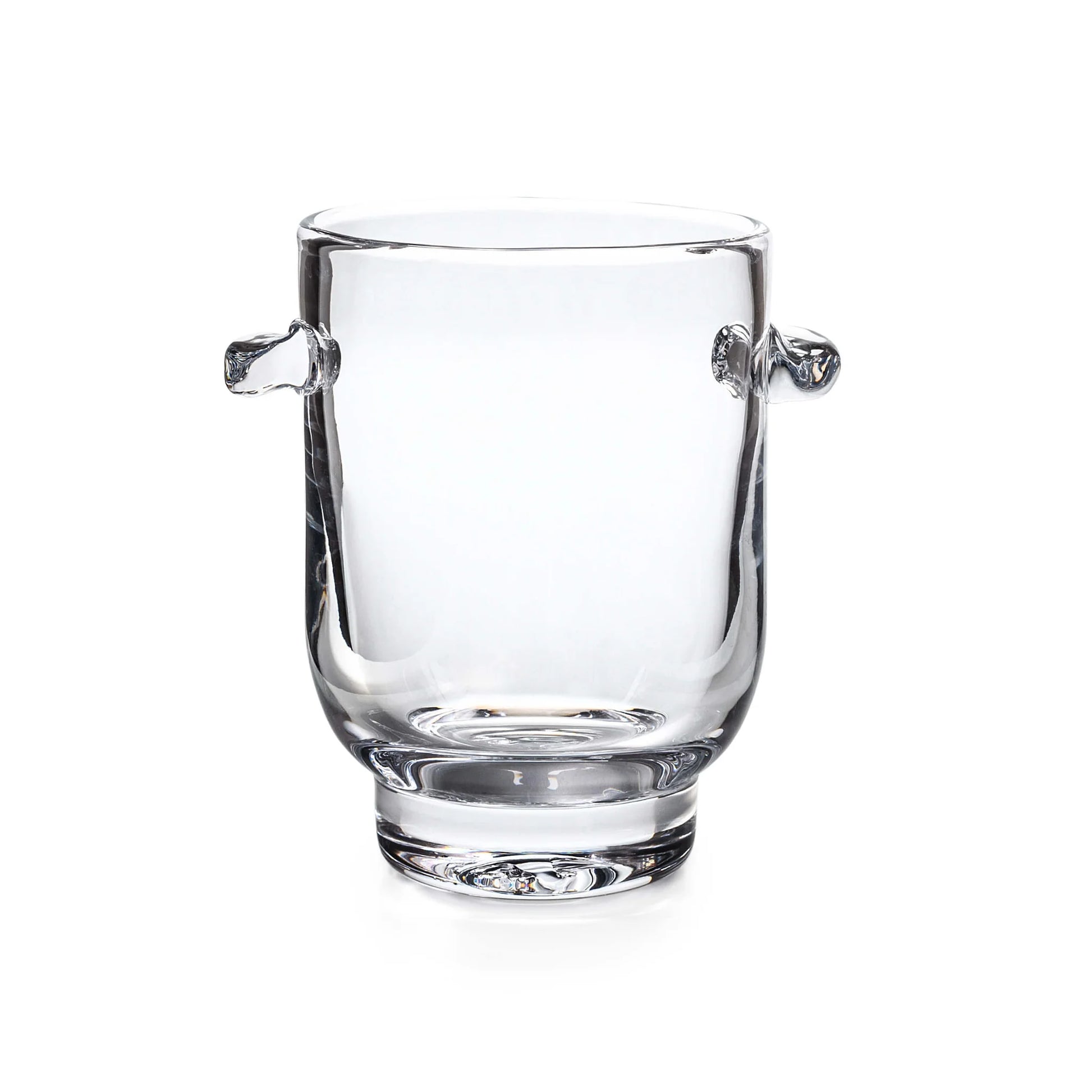 A modern glass ice bucket, designed with generous geometric proportions. Simple upturned handles and a sturdy cylindrical foot give it grace and substance. Perfect for chilling a bottle or serving up rocks on your bar.