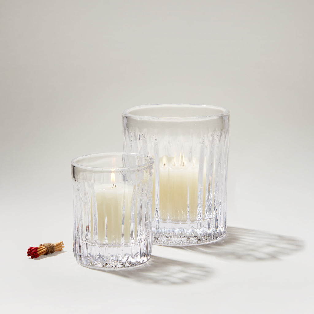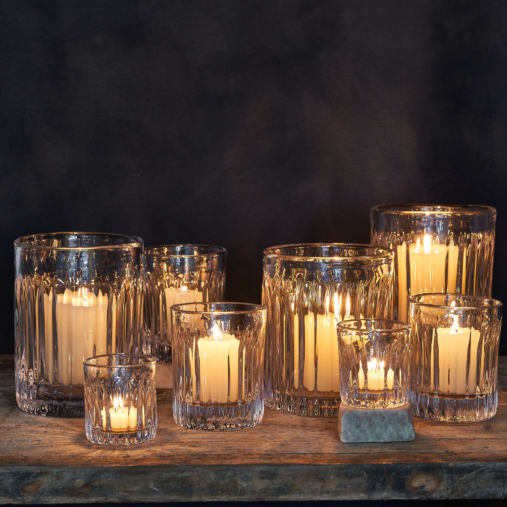 The Montpelier Hurricane brings the collection’s architectural fluted form into candlelight. Inspired by the neoclassical detailing found in Vermont’s capital buildings, its vertical ribbing gives the glass a structured, column-like presence while allowing light to move naturally through the form.