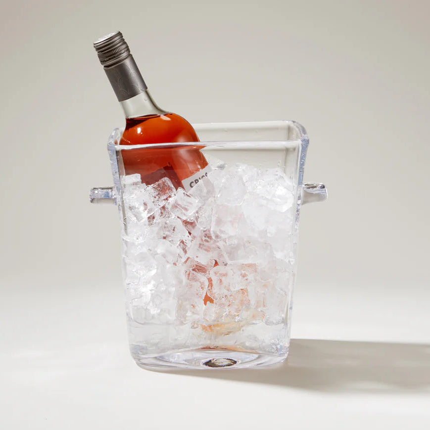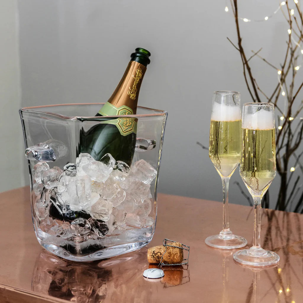 A Simon Pearce signature, the contemporary angles of Woodbury add balanced geometry to any setting. Here, this squared-off glass ice bucket features brilliant flat panes that showcase the clarity of the material. Use it to chill whites, rosés or sparklers, to serve ice on the bar, as an oversized vase, or filled with your favorite keepsakes. Perfect for personalized engraving.