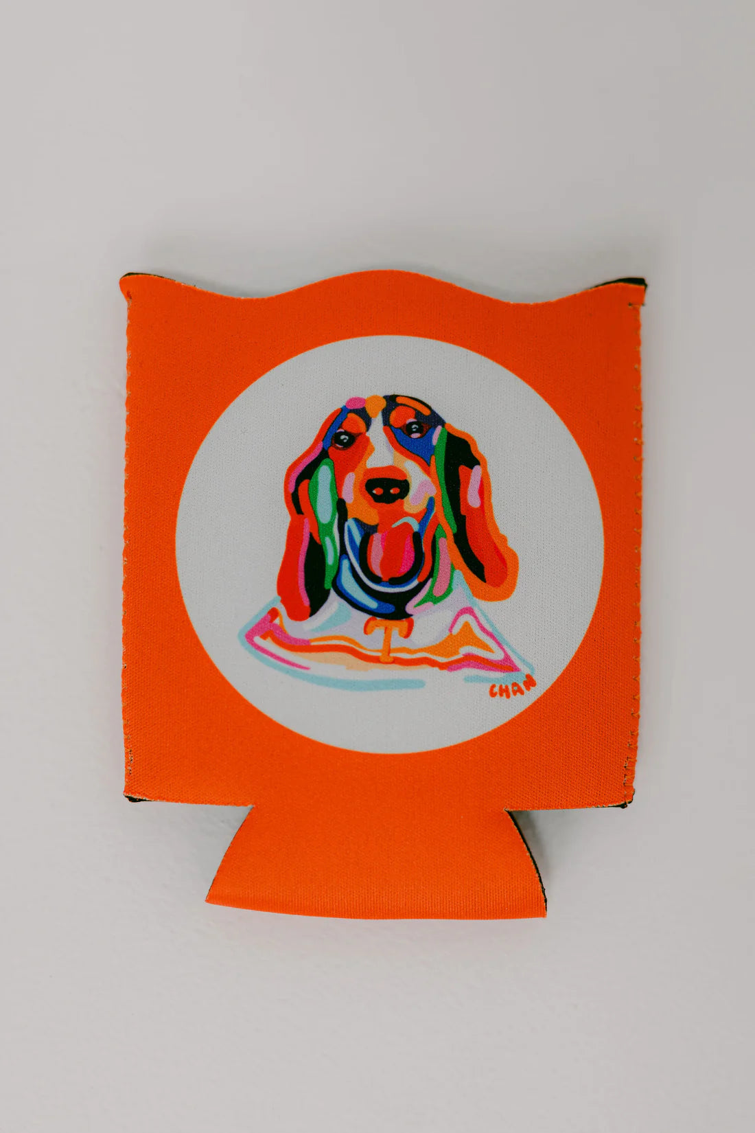 Our beloved Smokey printed onto a bright orange koozie.