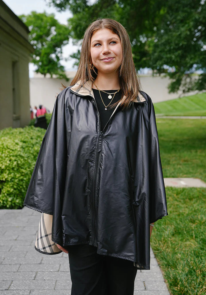 The RAINRAP is a fashionable and practical alternative to the traditional bulky rain jacket. The design of the RAINRAP combines the popular style of the pashmina and wrap. The RAINRAP is water-repellent, reversible, lightweight, fast-drying, has two shell buttons, a concealed magnetic closure and is easy to store in its matching black travel pouch.