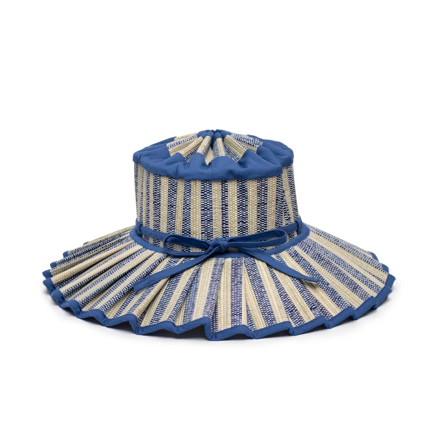 Valletta features jasmine-white coloured individual threads, woven through its striped hand-dyed royal-blue and natural grass fibre base, to create a muted hazy appearance, with royal-blue coloured fabric trimming.