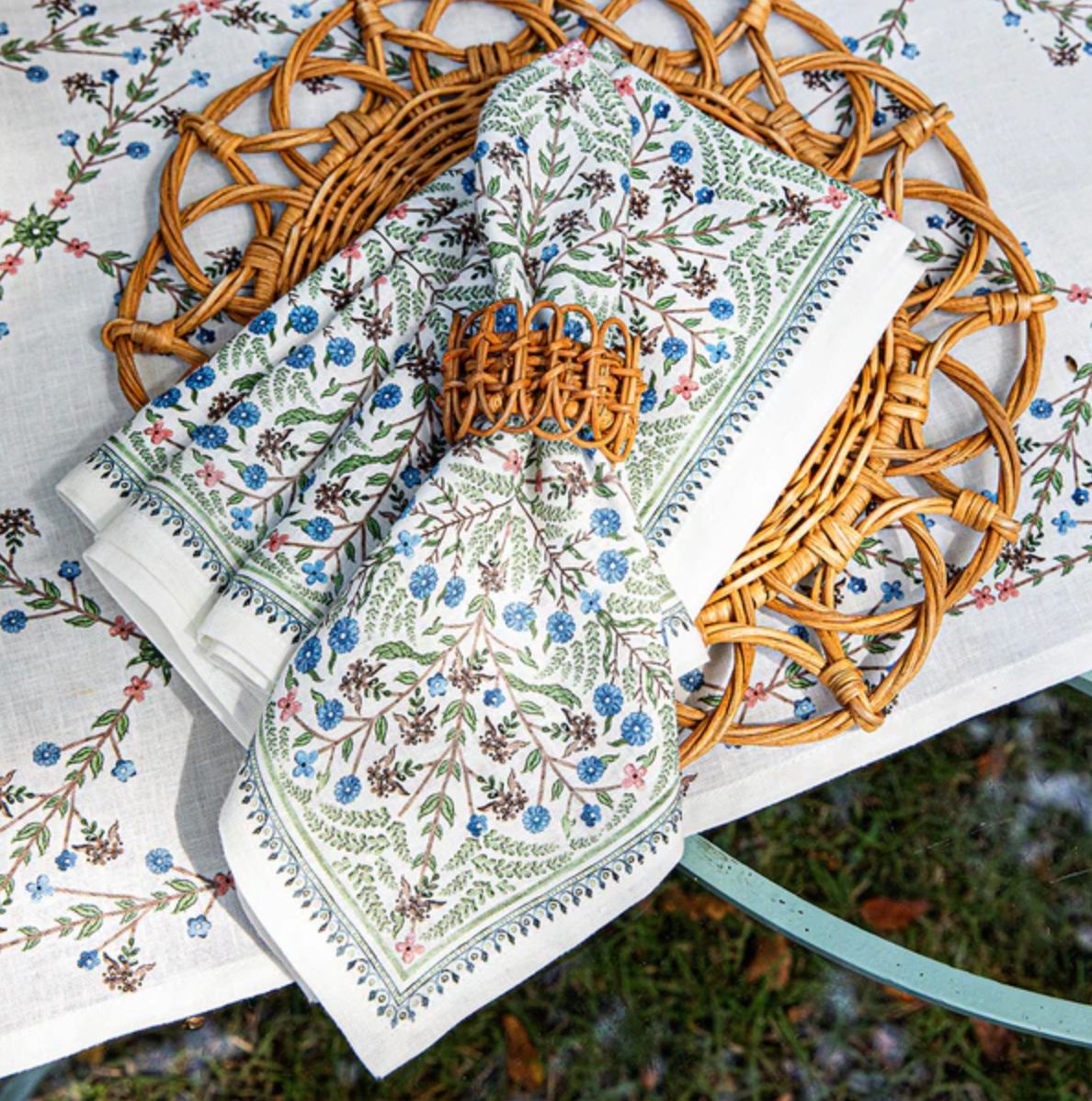 This pure linen napkin is adorned with painterly bursts of intricate leaves and folkloric wildflowers in greens, blues and pinks inspired by the Spanish countryside, with a trim of tiny garlands of blossoms in exquisite detail. Fresh, verdant and a bit whimsical, this enchanting motif mixes and matches like a dream for everyday entertaining and special occasions alike.