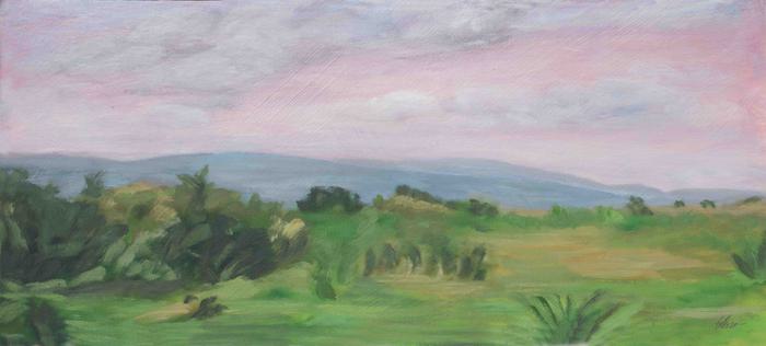 Violet Crown unfolds a serene landscape of rolling hills and verdant pastures, framed by a distant treeline under a pale rose sky at dusk. This composition captures the tranquil essence of evening's gentle close, offering a window to nature's quiet majesty. An invitation to the timeless peace of the great outdoors.